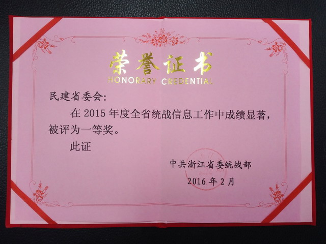 2015年,民建省委會圍繞中心、服務大局,及時反映統戰工作中的新情況、新進展和會員中的思想動態、意見建議,味服務領導決策、推動工作落實發揮了積極作用。因成績顯著,民建省委會獲2015年度全省統戰信息工作一等獎。