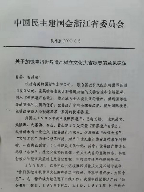 2000年2月,民建省委會向中共省委、省政府報送了《關于加快申報世界遺產 樹立文化大省標志的建議》,充分認識申報世界遺產的重要性,認識申遺標準嚴、周期長、競爭強的艱巨性,發揮浙江良渚遺址群、西湖、普陀山、雁蕩山、楠溪江等項目優勢,正式啟動申遺,早日實現浙江世界遺產零的突破。中共省委書記、分管副省長作出批示,省委、省政府“兩辦”’要求有關市、縣和部門認真研究,制定規劃,提出可行方案,積極組織實施。12月,《浙江省建設文化大省綱要(2001——2020)》提出到2020年浙江爭取有一處世界文化遺產。