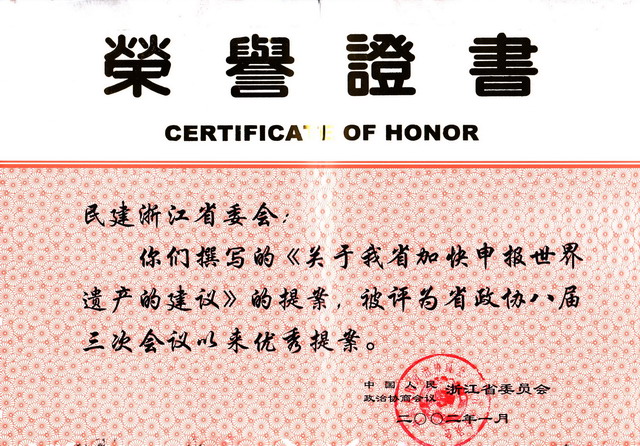 2003年 5月,民建省委會向時任省長呂祖善專報三點申遺建議。呂省長以及兩位副省長批示,省政府辦公廳牽頭組織調研,提出了全省申遺工作的五點意見。