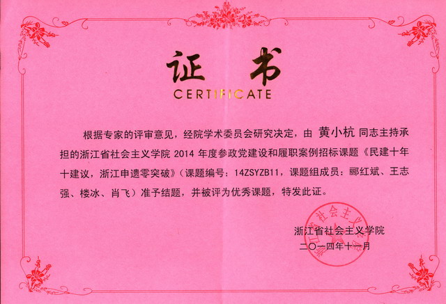 2008年1月,省政協十屆一次大會,時任省政協常委、民建省委會專職副主委兼秘書長黃小杭作了《迎接浙江世界遺產零的突破》的大會發言。經過十年的艱苦不懈努力,浙江若干項目已經進入正式申報、考察和票決階段,多地勇當2010年零突破的先鋒。形勢喜人,更要科學嚴謹,民建提出浙江申遺的三個梯隊:第一梯隊是近期突破的三個項目,丹霞地貌(包括浙江江郎山)、西湖,爭取在2010、2011年申報成功,以及大運河(包括浙江段);同時繼續積極準備第二、三梯隊,第二梯隊的首選是良渚遺址,隨著遺址發掘不斷突破,地位提高,申遺位次可能前移。按照世界遺產規則辦事,是申遺成功的重要保證,既要制止“建設性的破壞”,更要防止“保護性的破壞”。分管副省長作了批示。